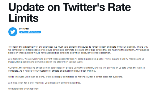 트위터는 이러한 조치가 주로 누군가가 사용자 데이터를 캡처하여, AI 모델을 구축하는 것을 방지하고 플랫폼이 조작되는 것을 방지하기 위한 것이라고 말했습니다.